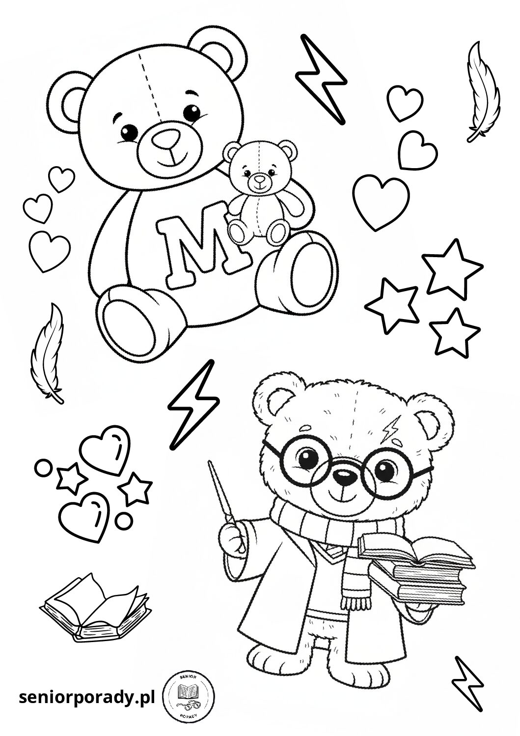 Znajdziesz tu 2 urocze wzory (np. miś z serduszkiem, miś przytulanka), które są idealne na wyciszenie i kreatywną zabawę kolorami. Idealne nawet dla najmłodszych, którzy dopiero ćwiczą precyzję.
