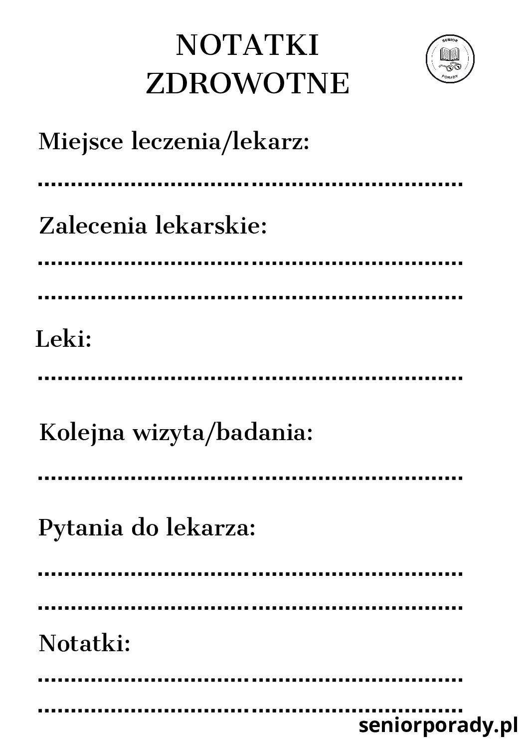 - 📝 Notatki Zdrowotne: Miejsce na zapisanie wyników ciśnienia, cukru czy pytań, które chcesz zadać lekarzowi na wizycie.
